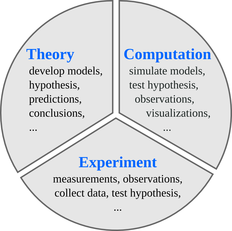#!/usr/bin/env python # coding: utf-8 # Introduction to scientific computing with Python # J.R. Johansson (jrjohansson at gmail.com) # # The latest version of this [IPython notebook](http://ipython.org/notebook.html) lecture is available at [http://github.com/jrjohansson/scientific-python-lectures](http://github.com/jrjohansson/scientific-python-lectures). # # The other notebooks in this lecture series are indexed at [http://jrjohansson.github.io](http://jrjohansson.github.io). # ## The role of computing in science # Science has traditionally been divided into experimental and theoretical disciplines, but during the last several decades computing has emerged as a very important part of science. Scientific computing is often closely related to theory, but it also has many characteristics in common with experimental work. It is therefore often viewed as a new third branch of science. In most fields of science, computational work is an important complement to both experiments and theory, and nowadays a vast majority of both experimental and theoretical papers involve some numerical calculations, simulations or computer modeling. #